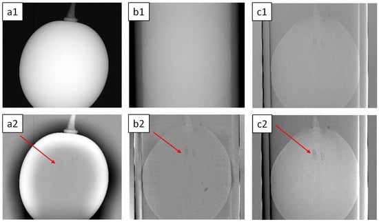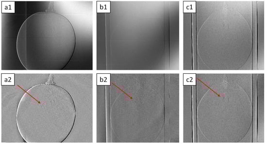 Deflection reconstruction of one grape for the X-axis: (a1) sample measured in air and reference taken in air, (b1) sample measured in water and reference taken in air, and (c1) sample measured in water and reference taken in water. The same images after the application of median filter (size 200 × 200 pixels) for artefact reduction (a2,b2,c2). The arrows point at the internal seeds of the grape.