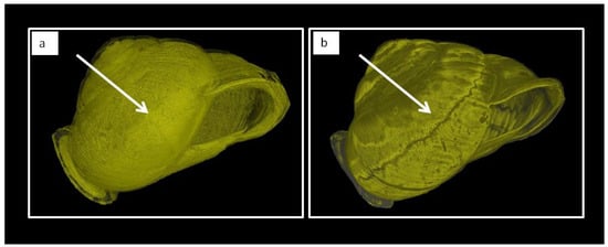 The 3D rendering was performed with the data analysis software Volume Graphics VGStudio Max 2.2.6. Three-dimensional rendered images of the absorption can be seen in Figure 8a) and deflection Figure 8b). Optimizing the rendering parameters, many small details can be seen on the surface of the shell in the deflection reconstruction (Figure 8b). Additionally, the presence of a crack on the outside of the shell can be seen on the 3D rendering of the deflection (Figure 8b), while it is absent on the absorption reconstruction (Figure 8b). The same rendering parameters were used for the two images.