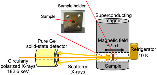 Magnetic Compton profiles were measured at high-energy inelastic scattering beamline 08W of SPring-8, Japan [18,19]. The experimental setup is shown in Figure 1. Circularly polarized 182.6 keV X-rays (circularly polarization factor is ≃ 0.55), which were emitted from an elliptical multipole wiggler, irradiate the sample. The size of the incident X-ray beam at the sample position is a 1 mm square, which is formed by the incident slit. The scattering angle is fixed at 178 degrees. The Compton-scattered X-rays were measured with 10 independent pure Ge solid-state detectors. The measurements were performed by applying a magnetic field of T to the sample at 10 K in a vacuum atmosphere. The magnetic Compton profile is related to the spin momentum density as follows [20]: