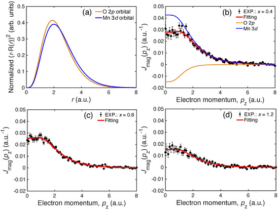 In order to extract atomic features driving the magnetic behavior in Figure 2, we have carried out a curve-fitting analysis of the magnetic Compton profiles, as illustrated in Figure 3b–d. Figure 3a shows radial distributions of the orphaned O 2 orbital and Mn 3 orbitals. The areas under the radial distributions are normalized to the same value. The magnetic Compton profiles are normalized by the spin magnetic moment for each Li concentration. The curve-fitting is performed by using: