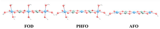 Note that FOD, AFO, and PHFO can be in the α—monoclinic, β—orthorhombic, or mixed states [6,11], and that their molecular and crystal structures are pressure dependent [15]. Bearing this in mind, we used a single chain of the three coordination polymers and ran the calculations on a subunit of their chain structure in order to focus on their intrinsic electrochemical properties rather than their structural features. The subunit contained three Fe ions, two C2O4 bidentate anions bridging the metal ions and two or zero axial water molecules for each metal center. To balance the charge of the structures in accord with the coordination mode of the removed oxalate anions, each tail oxalate anion was represented by one OH anion and one neutral OH group, which resulted in a neutral model. The orientation of the water molecules was adjusted along the lines of the study of Fan et al. [3]. The model structures are shown in Figure 1. The efficacy of the adopted models was further verified by comparison to experimental data and periodic calculations as discussed below and in the “Results and discussion” section. All model-based calculations were performed using the Gaussian 16 A.03 package [16].