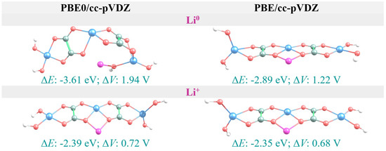 Considering Li intercalation, the OCVs of AFO, PHFO, and FOD at the PBE/cc-pVDZ (and PBE0/cc-pVDZ) level/s were calculated to be 1.22 V (1.94 V), 1.34 V (3.13 V), and 2.85 V (3.58 V), respectively, see Table 2 and Figure S3. Zhang et al. reported the reducing and oxidating peaks of 0.75 V and 1.5 V for their @-FeC2O4 electrode, respectively [11]. Their anodic voltage (1.5 V) agrees with that of PHFO, which lacks the axial water molecules of its central Fe ion, but it is higher than our predicted AFO voltage. This clarifies the impact of hydration level and crystalline structure on the electrochemical activity of the ferrous oxalate family and recommends the application of fully dehydrated ferrous oxalate as an anode material.