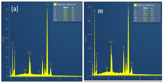 Figure 4a,b shows EDX spectra of as-prepared TiO2/MAPbI3, 200°C/MAPbI3, and annealed MAPbI3 heterogeneous thin films. In these results, all the expected elements such as Ti, O, Pb, and I were attained; however, the C element emerged from the carbon tape on which the samples were mounted. The EDX peak position (keV) and intensities (cps/eV) values provide excellent qualitative and quantitative analysis of the elements present in the TiO2/MAPbI3 heterogeneous thin films, respectively, consistent with SEM surface analysis. There were no significant differences worth mentioning in the proportion of expected elements in any of the annealed samples. The weight percent of Ti, O, Pb, and I elements obtained from EDX is nearly stoichiometric.