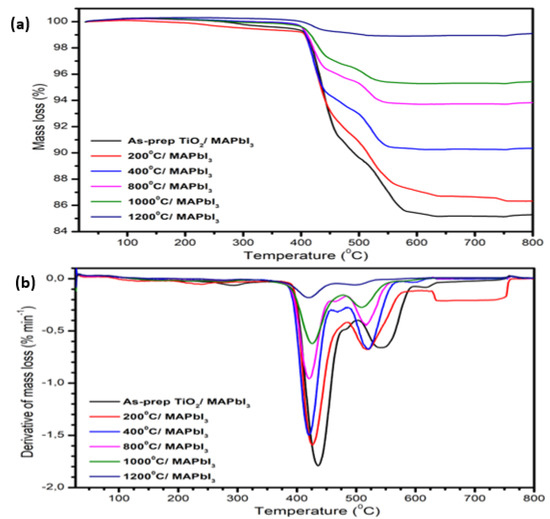 To understand the thermal behavior and determine the degradation steps from the TiO2/MAPbI3 perovskite heterogeneous thin films TGA analysis was performed by heating the samples from ambient temperature to 800 °C in triplicate, average values are reported in Table 1. From the percentage mass loss in Figure 6a, it is apparent that all the heterogeneous thin films are thermally stable, recording a maximum mass loss percentage of 15.7% at high temperatures of up to 800 °C. The as-prep TiO2/MAPbI3 heterogeneous thin films experience the highest mass loss, recording a final residual mass percent of 84.3%. The remaining heterogeneous thin films increase systematically with increasing annealing temperature, exhibiting mass residues greater than 84.3%. A minimum of 2.2% mass loss is recorded for the 1200 °C/MAPbI3 heterogeneous thin films. This shows that annealing of the TiO2 nanopowder removes temperature-initiated degrading agents, resulting in thermally stable heterogeneous films. This observation is further depicted by the decreasing peak intensities in the DTGA graphs in Figure 6b. This systematic increase in the residual mass % in the heterogeneous films is further correlated to the TiO2 phase transformation. TiO2 NPs are naturally characterized by thermal transitions from the metastable phases to the stable rutile phase. Therefore, samples annealed at higher temperatures possess the thermodynamically stable rutile phase, whereas samples at lower annealing temperatures are metastable anatase phases. Hence, the 2.2% mass loss belongs to the heterogeneous samples bearing more stable-TiO2 NPs. In Figure 6a,b TiO2/MAPbI3 heterogeneous thin films decompose through three degradation mechanisms located at temperatures ≥ 106, 438, and 513 °C. The first and small degradation step located at ~106 °C is associated with the evaporation of absorbed water molecules on the surface of TiO2 NPs, the second degradation step approximated at 438 °C is associated with the characteristic TiO2 anatase to rutile phase transition [24,25]. As expected in both events, the mass loss % is significantly reduced with increasing annealing temperature as outlined above and summarized in Table 1. The third degradation step results from the decomposition of the MAPbI3 perovskite by desorption of volatile MAI organic group [26].