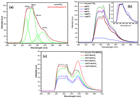 Photoluminescence (PL) is used to characterize photogenerated recombination pathways caused by defect levels within the bandgap structure of a semiconductor and the resulting PL peak emissions indicate the recombination of excitons, electrons, and holes between the conduction band and valence band. TiO2 NPs are characterized by PL peak emissions caused by oxygen vacancies, surface states, and free and bound exciton recombinations [20,21,27]. The emission spectra in Figure 7a–c present PL peak emissions in the 300–700 nm range obtained from the excitation wavelength of λex = 238 nm for the as-prep TiO2 nanopowder, annealed TiO2 nanopowders, and as-prep TiO2/MAPbI3 and annealed heterogeneous thin films. The peak emissions were analyzed to investigate the effect of annealing/phase transformation on the recombination efficiencies. The deconvoluted gaussian fit for the as-prep TiO2 nanopowder in Figure 7a shows characteristic peak emissions centered at λem = 426, 466, 501, and 537 nm, a similar PL spectrum has previously been reported by Tsega et al. [27] and Acchutharaman et al. [21]. The prominent emissions located at 426 and 466 nm are associated with the oxygen vacancies and surface state dominant defect levels in the TiO2 forbidden gap, whereas the shoulder peak emissions at high wavelengths of 501 and 537 nm are associated with the free edge and bound exciton minority recombinations. Figure 7b demonstrates the effect of annealing multiphase-TiO2 on the material’s recombination rates, insert of Figure 7b (normalized peak intensities) presents similar peak emissions reported in Figure 6a indicating that throughout the annealing process the peak emissions result from intrinsic trapping sites within the forbidden gap of multiphase-TiO2. From Figure 7b, it is observed that by increasing annealing temperature, the multiphase-TiO2 NPs undergo PL quenching. The observed luminescence quenching may be attributed to several factors, including the presence of trap centers, grain boundary defects, and the band structure thermal quenching effect. In this study, the band structure thermal quenching is observed indicated by the decreasing trend in peak intensities of the samples as follows; from the samples: as-prep TiO2 → 200 °C → 400 °C. This indicates that the intrinsic recombination rates (or concentration of defect levels) from oxygen vacancies, surface states, and excitons are significantly reduced. A similar observation has been reported by Fan et al. [20] in mixed-phase TiO2 NPs and is ascribed to the increase in TiO2 degree of crystallinity and the desorption of oxygen molecules reducing TiO2 dominant defect levels. However, with a further increase in annealing temperature, a counteractive phenomenon emerges, substantially increasing the peak intensities dramatically. This apparent change in behavior from the PL peak emissions is attributed to the multiphase-TiO2 phase transition and an increase in TiO2 particle size. Comparable results are reported by Yun et al. [16] and Ruan et al. [19] demonstrating that more rutile phase formation and large particle size result in a low electron mobile phase and increased light-scattering, respectively, providing an efficient charge carrier recombination pathway.