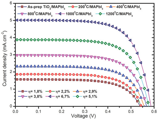 Figure 8 depicts a simplified schematic image of the devices. Figure 9 shows IV characterization curves measured under AM1.5G and 1000 W/m2 standard illumination conditions. Table 2 summarizes electrical average parameter values with standard deviations from the three best cells for each sample. The power conversion efficiency of the devices given in Table 2 is calculated from Equation (1). From the IV curves in Figure 9 and Table 2, it is observed that there is a prominent increase in current density (Jsc) and power conversion efficiency (ղ) from the PSCs with increasing rutile phase content and annealing temperature. This observation is correlated with the increasing MAPbI3 surface coverage morphology (SEM) over the large multiphase-TiO2 NPs, and the evident decrease in PL in Figure 7c, resulting in enhanced Jsc and ղ. This indicates that the increase in the rutile phase establishes an efficient electron transfer from the photoexcited perovskite material into the conduction band of the anatase phase. A maximum of 6.7% efficiency is achieved for the solar cells fabricated from the 1000 °C/MAPbI3 heterogeneous thin films. Therefore, the IV characterization demonstrates that although the rutile phase is characterized by slow electron mobility resulting in increased multiphase-TiO2 recombination rates as shown in Figure 6b, the increasing PSC performance with increasing rutile content demonstrates that rutile is a high electron harvesting phase that extracts maximum photogenerated electrons from the perovskite material into the more electron mobile anatase phase decreasing the recombination as shown by Figure 7c. This is followed by a significant decrease to 5.1% efficiencies as rutile becomes the more dominant phase indicating that phase optimization in the multiphase-TiO2 NPs is required for optimal PSC performances.