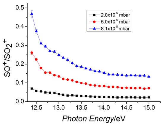 Ratio of the SO•+/SO2•+ as a function of the photon energy in the reaction of SO2•+ with carbon monoxide. The nominal collision energy is 0 eV. Different pressures of carbon monoxide: 8.1 × 10−5 mbar (blue line), 5.0 × 10−5 mbar (red line), and 2.0 × 10−5 mbar (black line). Reprinted with permission from [29]. Copyright (2019), Frontiers.
