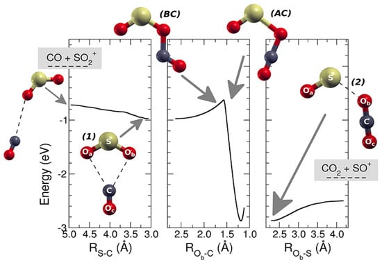 MEP for the reaction SO2•+ with carbon monoxide leading to SO•+ and carbon dioxide. On the left there is the approaching region where the reactants are shown (leftmost structure), together with the geometry of the first complex [SO2–CO]•+ (1). In the central panel, it is shown the barrier (intersystem crossing) and the geometry of the molecular complex just before (BC) and after the crossing (AC). On the right, the region of the products is shown together with the geometry of the most stable complex (2) [OS–OCO]•+. Reprinted with permission from [29]. Copyright (2019), Frontiers.