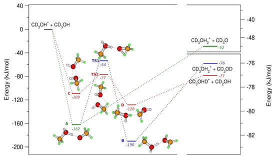 From experimental data, the formation of CD3O(H)D+ and CD3O(H)H+ ions are observed, whereas the isomerization of CD3O• into a •CD2OD radical should also be considered when the energy gain obtained in the formation of the reactive complex is enough to overcome the barrier that leads to the formation of •CD2OD. The interaction of CH3OH (CD3OH) with CH3OH•+ (CD3OH•+) has been also studied with computational chemistry models, so that a full comprehension of the dynamical aspects of these reactions can be obtained at hν < 11.7 eV [51]. In Figure 9, the geometries and the relative energies of the molecules active in reaction (a) and (b) of the Scheme 1 are reported.