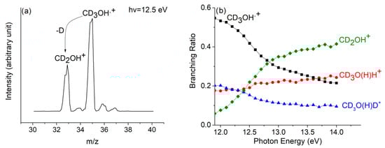 The mass spectrum of CD3OH+, without reaction with neutral methanol, is reported in Figure 10a at hν = 12.5 eV. The loss of the D atom from CD3OH•+ produces the peak at m/z = 33, which is related to the CD2OH+ ion, whereas the very small peak at m/z = 34 can be related to the CD2OD+ due to the scrambling of the hydrogen atom. We have excluded the formation of the CD3O+ species since its appearance energy is determined to be higher than 15.0 eV [49].