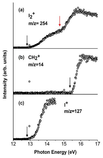 Photoionization efficiency curves (PIECs) of the three fragment ions I2+ (a), CH2+ (b), and I+ (c) from the [CH2I2]+ parent ion. The AEexp values are indicated by black arrows. The red arrow in (a) indicates a clear change of slope in the I2+ PIEC at the photon energy around 14.90 ± 0.05 eV. Reprinted with permission from [62]. Copyright (2015), AIP Publishing.