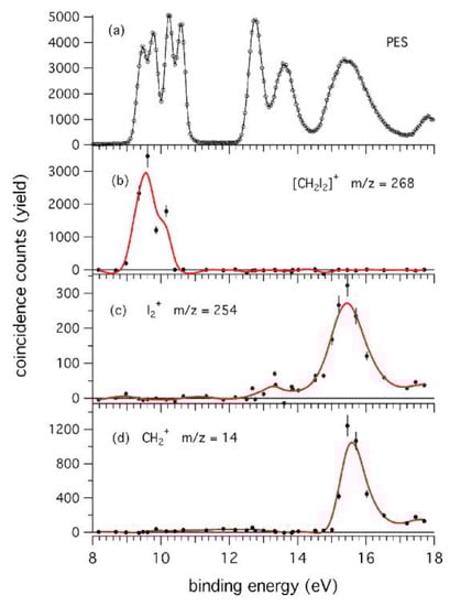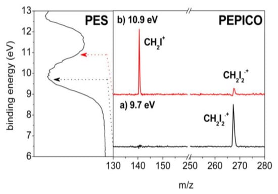 The results show that the appearance energy of I2+ (AEexp) is 12.76 ± 0.03 eV. Moreover, the PEPICO measurements (Figure 12) demonstrate that the I2+ loss involves electronic states with B.E. >12.0 eV as well as the channel that produces CH2+ (AEexp = 15.34 ± 0.05 eV). In the latter case, theoretical calculations demonstrate that the formation of CH2+ ions produce two iodine atoms and not the I2 molecule. As clearly seen in Figure 12, the parent ion (m/z = 268) is present until BE~11 eV [62].