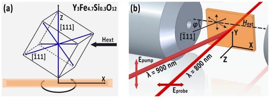 The magnetic properties of the film were determined using the magneto-optical Faraday effect and MOKE imaging with in-plane magnetization. According to the YIG crystallographic symmetry, the influence of cubic anisotropy was expected, and the sample was installed with the possibility to change orientation of the [11] axis projection on the film plane relative to the X-axis of the laboratory frame, determined by the angle φ (Figure 1a).