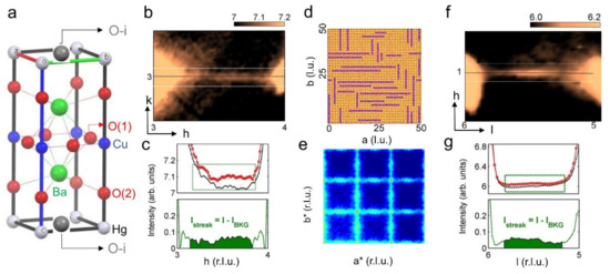 Nematic phase of atomic oxygen wires has been investigated by high-energy X-ray diffraction measurements performed at the BW5 beamline of the DESY Synchrotron in Hamburg. The results provide compelling experimental evidence for the location of the oxygen interstitial (O-i) content, y, which occupies the interstitial site ½, ½, and 0 in the basal plane of HgBa2CuO4+y. The arrangement of O-i gives rise to intriguing diffraction features constituted by clear diffuse streaks crossing the Bragg peaks along all the three crystallographic directions [56,57,58]. In Figure 1b, we show a typical diffuse streak between the (3,3) and (3,4) reflections in the hk diffraction plane. Figure 1c shows the streak profile in red and the background in black. The normalized X-ray diffraction profile is shown in the lower panel, where the diffuse streak intensity has been quantified by the difference between the Bragg peaks profile and the background. In this way, we obtained the streak intensity, due to the O-i stripes. The connection of the observed streaks with the O-i arrangement in stripes has been proved by calculating the X-ray diffraction pattern of a HgBa2CuO4.12 lattice made by 50 × 50 × 20 unit cells. In this model structure, the O-i located with positive correlations along the a- and b-axes has been created by the Monte Carlo method [63] using the software package DISCUS [64].