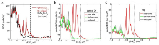 The density of states at the Fermi energy, N(EF), is higher than the undoped system, about 3 eV−1 per elementary cell. The increase in DOS is limited to the Cu adjacent to the O-i wire; see Figure 3 and Table 1. Ba and Hg atoms are negligible N(EF) in the undoped case, but the striped O-rich system shows a large increase in DOS on the sites near oxygen interstitials [60]. Hybridization with the p-states on the oxygen interstitials creates a large s- and d-DOS on Hg, and increase in the p-DOS on apical and planar oxygen states. The increase in the local DOS can be understood as an effect due to the O-i atomic stripe, which forms electronic wires with high hole doping when EF is approaching the wire van Hove DOS peak. The local DOS is very small in more distant atoms in the other atomic layers (BaO, Hg) with values very similar to the undoped Hg1201. At two lattice units from the O-stripe, the DOS already seems to have restored its local character as an undoped Hg1201, except for the modest increase in Cu-d DOS. Moreover, this is corroborated by the electric charge density within the Cu atoms, as well as by an analysis of the folded FS [60].