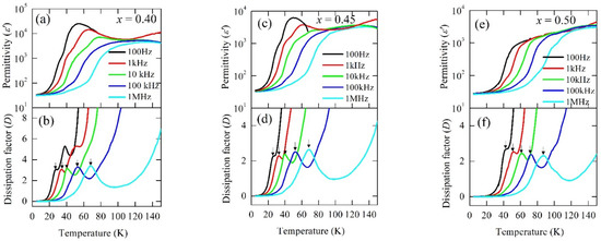 The real part of dielectric permittivity, ϵ’(ω, T), versus temperature (T) patterns measured for several frequencies across the temperature range 4−150 K are shown in the upper panels of Figure 2 for representative samples of PCMO with Ca contents: x = 0.40, 0.45, and 0.5. The dissipation factor D(ω, T) versus the T plot for those compositions are also shown in the lower panels of Figure 2. A typical feature of dielectric relaxation behaviour for all the samples was observed clearly. At temperatures above 100 K, ϵ’(ω, T) reached a value as high as ε’~104 with almost no variation with temperature and frequency, and with decreasing temperature, ϵ’(ω, T) showed step-like decrease and attained a temperature- and frequency-independent value of about ϵ’~30−50. The characteristic temperature (T) at which the inflection in ϵ’(ω, T) occurred was also associated with a peak in the corresponding D(ω, T) versus the T plot, which gradually shifted towards the higher temperature with increasing frequency. This confirmed the thermally activated dielectric relaxation process [17,18].