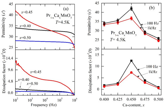 However, at a sufficiently low temperature, the thermally activated charge carriers were frozen out, the dielectric response was free from the relaxation behaviour due to polaron hopping, and the dielectric response was dominated by the ionic lattice contributions [24,25]. As shown in Figure 3a, the frequency window (100 Hz to 1 MHz) over which the ϵ’(ω) and D(ω) were measured was free from the typical dielectric relaxation due to polaron hopping and whatever frequency dispersion was observed at T = 4.5 K arose from the ionic-lattice contributions. In Figure 3b, we plotted the variation of ϵ’(x) and D(x) as functions of Ca content, x, for 100 Hz and 1 kHz frequencies. For both the frequencies, the ϵ’(ω) and D(ω) exhibited similar x-dependence, and one can observe a conspicuous peak in ϵ’(x) and D(x) at x = 0.45.