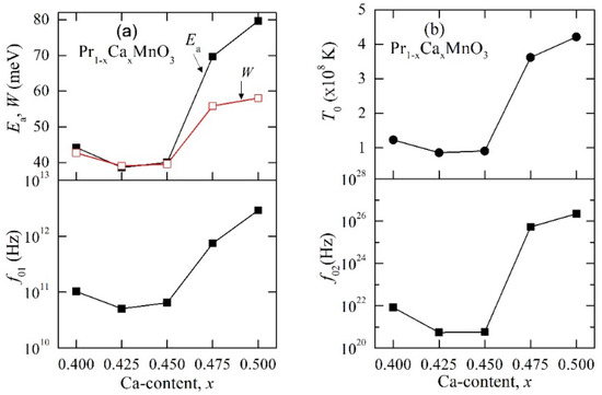 In Figure 4b, we plotted the variation of τ−1 as a function of 100/T1/4 in the temperature range 25–90 K, i.e., according to the three-dimensional VRH model. The linearity of the plot indicates that the conduction mechanism in PCMO was governed by thermally assisted hopping of charge carriers in three dimensions. It is important to note that the SPH plots showed certain deviations from the linearity, which indicates that VRH was the dominant mechanism for charge conduction of PCMO in the measured temperature range. Mott activation energy, T0, and pre-exponential factor, f02, were estimated from the linear fitting τ−1 vs. 100/T1/4 plot and plotted as a function of x in the upper and lower panels of Figure 5b, respectively. Similar to the SPH model, both the parameters exhibited a broad minima near x = 0.425. In the Mott VRH mechanism, the hopping energy, W, of a polaron can be estimated using the relation . Taking T = 50 K, an average temperature around which the dielectric relaxation was analysed, we obtained the value of polaron hopping energy, W, for PCMO samples and plotted them as a function of x in the upper panel of Figure 5a alongside of Ea(x) for comparison. The W(x) also showed a similar Ca content dependence to that of the activation energy, Ea(x), estimated from the SPH model.