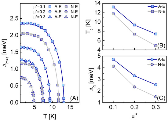 Figure 1C for the adiabatic and non-adiabatic regimes by considering selected Coulomb pseudopotential values. We observe that the superconducting gap is notably higher in the adiabatic case when comparing to the non-adiabatic one. From the theoretical standpoint, this is an expected behavior, since materials with higher gap values should present more enhanced superconducting properties than their narrow-gap counterparts [