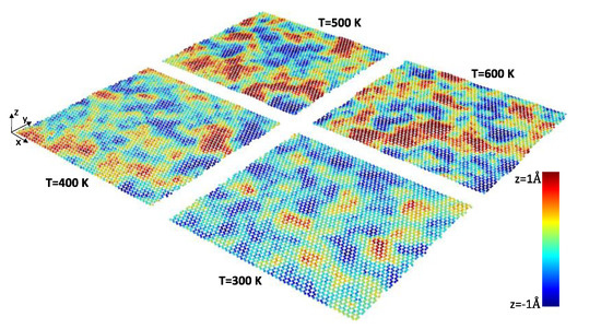 Figure S1 of the supporting information document shows the results for the evolution of per-atom area of the supported monolayers as a function of temperature for the interaction strength of ε = 2 meV. As it can be seen, for full-carbon structures of graphene and phagraphene, the projected area increases with the temperature rises. This means that in addition to the increase in wrinkles heights due to the rise in temperature, the bond length elongation also affects the total area variation. This is in contrast to the behavior of the suspended monolayers, as observed in our previous work [11]. To better illustrate the increase in the wrinkles formation in graphene due to temperature rise, in Figure 2 we illustrate the contour of atomic out-of-plane displacement for four temperatures of 300, 400, 500, and 600 K. In contrast to supported graphene and phagraphene, the projected area of supported C3N and BC3 with the interaction strength of ε = 2 meV, decreases when the temperature increases, as shown in Figure S1. This finding reveals that the increase in out-of-plane deflection of these structures by the temperature rise is more dominant as compared with the bond length elongation. Table 1 shows the coefficients of the fitted 3rd order polynomial function on the size variation of the monolayers with respect to the temperature and the corresponding area at 300 K.