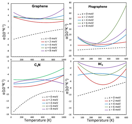- The increase in the strength of interaction between the substrate and the 2D material from 0 meV to 8 meV leads to increase of the algebraic value of the thermal expansion coefficient, which at room temperature was predicted to raise from: −2.95 × 10−6 K−1 to 3.15 × 10−6 K−1 for graphene, from −6.49 × 10−6 K−1 to 3.62 × 10−6 K−1 for phagraphene, from −11.9 × 10−6 K−1 to −5.76 × 10−6 K−1 for the C3N, and from −8.51 × 10−6 K−1 to −1.95 × 10−6 K−1 for the BC3 monolayer.