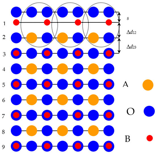 With the aim of computing the neutral BO2-terminated (001) surfaces of ABO3 solids, we customized symmetrical slabs. They involved nine neutral as well as alternating BO2 and AO layers (Figure 1). All of these nine layers were perpendicular to the [001] crystal direction [108,109,110,111]. Taking into consideration the standard ionic charges equal to (+2e) for the A atom and (+4e) for the B atom, as well as (−2e) for the O atom, both alternating BO2 and AO layers are neutral, since they have a summary slab charge equal to zero. The slab, containing nine layers, used by us for the BO2-terminated ABO3 perovskite (001) surface computations (Figure 1) consisted of a supercell containing 23 atoms. Our hybrid-DFT computed BO2-terminated (001) slabs (Figure 1) of ABO3 perovskite were non-stoichiometric. They have a unit cell, used in our hybrid-DFT computations, described by the following chemical formula—A4B5O14 [112,113,114].