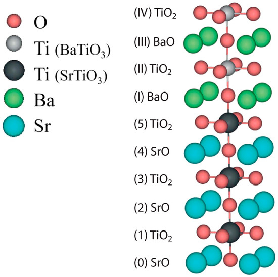 As a next step, we will discuss our calculation details for the ABO3 perovskite (001) heterostructures, using as an example the BaTiO3/SrTiO3 (001) interface. At room temperature, the SrTiO3 substrate has a high-symmetry cubic structure. In our hybrid-DFT computations, we computed both SrTiO3 and BaTiO3 perovskites at their cubic, high-symmetry phase with the space group number . In our hybrid-DFT computations, we modelled the BaTiO3/SrTiO3 (001) interface employing the single-slab model. In order to maximally apply the advantages of symmetry, our slabs were symmetrically terminated. In our hybrid-DFT computations, the SrTiO3 (001) substrate always contained 11 alternating SrO as well as TiO2 layers. From 1 to 10 BaO and TiO2 alternating layers were augmented on both sides of the 11-layer TiO2-terminated SrTiO3 (001) substrate (Figure 3).
