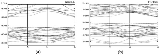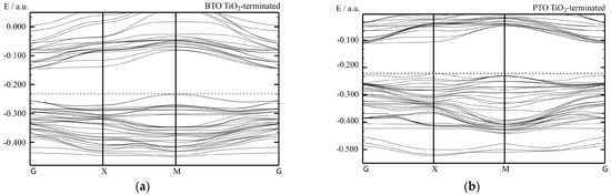 As a next step, we computed the bulk band gaps at the Γ-point for PbTiO3, BaTiO3 and SrTiO3 perovskites and plotted the band structure for BaTiO3 and PbTiO3 crystals. We compared our hybrid-DFT computation results for Γ-Γ band gaps with available experimental results. Our B3PW computed SrTiO3 bulk Γ-Γ band gap is equal to 3.96 eV, which is in fair agreement with the available experimental data for SrTiO3 direct Γ-Γ bulk band gap equal to 3.75 eV [124] (Table 2). The direct Γ-Γ bulk band gap in the BaTiO3 perovskite is measured experimentally (Table 2) at the tetragonal to orthorhombic phase transition temperature equal to 278 K. The BaTiO3 direct bulk Γ-Γ band gap in different experimental conditions is slightly different and is equal to 3.27 eV or 3.38 eV, respectively [125]. Our B3PW computed BaTiO3 direct bulk Γ-Γ band gap (3.55 eV) (Table 2) is in almost perfect agreement with these experiments (Figure 4a). Finally, our B3PW computed PbTiO3 bulk band gap at Γ-point (4.32 eV) (Figure 4b) (Table 2) is in satisfactory agreement with the experimentally detected direct PbTiO3 bulk Γ-Γ band gap (3.4 eV) [126] at the PbTiO3 perovskite tetragonal phase.