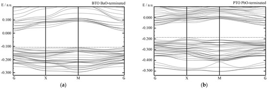 Our B3PW computed bulk band gaps (Figure 4) for PbTiO3, BaTiO3 and SrTiO3 perovskite bulk (4.32 eV, 3.55 eV and 3.96 eV, respectively) are in fair agreement with the available experimental data [124,125,134] (Table 8). As we can see from Table 8 and Figure 5 and Figure 6, our B3PW computed (001) surface band gaps for all three perovskites and both (001) surface terminations are always reduced with respect to the PbTiO3, BaTiO3 and SrTiO3 bulk. Namely, our hybrid-DFT computed TiO2-terminated PbTiO3, BaTiO3 and SrTiO3 (001) surface band gaps are equal to 3.18 eV, 2.96 eV (Figure 5) and 3.95 eV, respectively. At the same time, our hybrid-DFT computed AO-terminated PbTiO3, BaTiO3 and SrTiO3 (001) surface band gaps are equal to 3.58 eV, 3.49 eV (Figure 6) and 3.72 eV, respectively, and are also smaller than the respective bulk band gap values at Γ-point (Table 8).