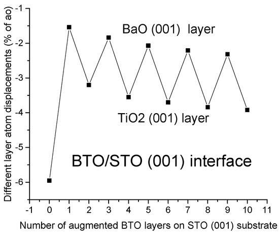 In the case of one augmented BTO (001) layer, consisting of the BaO atoms, the atom relaxation magnitude Δz is equal to −1.54% of the joint lattice constant a0 (Figure 3 and Figure 7). For two augmented BTO (001) layers, where the upper layer contains TiO2 atoms, the upper-layer atom relaxation magnitude Δz is equal to (−3.20% of a0) (Figure 7). For three augmented BTO (001) layers, the upper BaO layer atom relaxation magnitude Δz is equal to (−1.84% of a0), for 4 layers (−3.55% of a0), for five layers (−2.07% of a0), for six layers (−3.70% of a0), for seven layers (−2.21% of a0), for eight layers (−3.84% of a0), for nine layers (−2.32% of a0) and finally, for ten augmented BTO (001) layers, the upper TiO2 layer atom relaxation magnitude Δz is equal to (−3.92% of a0) (Figure 7).