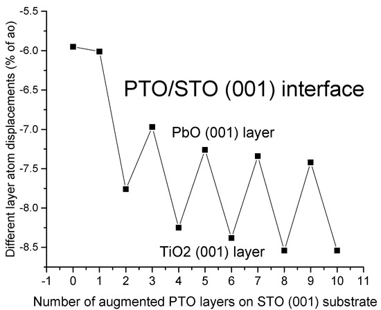 As we can see from Figure 8, for one augmented PTO (001) layer (x = 1), consisting of the PbO atoms, on the 11-layer STO (001) substrate (x = 0 for the substrate upper layer TiO2 atoms relaxation magnitude Δz), the upper layer PbO atoms’ relaxation magnitude Δz is equal to (−6.01% of a0). For two augmented PTO (001) layers, the upper layer consists of TiO2 atoms (x = 2), and their relaxation magnitude Δz is equal to (−7.76% of a0). For three augmented PTO (001) layers (x = 3), the upper layer consists of PbO atoms, and their relaxation magnitude Δz is equal to (−6.97% of a0). As we can see from Figure 8, for four augmented PTO (001) layers (x = 4), the upper TiO2 atoms containing layer atoms’ relaxation magnitude Δz is equal to (−8.25% of a0). For (x = 5), the upper augmented PTO (001) layer atom relaxation magnitude Δz is equal to (−7.26% of a0), for (x = 6) (−8.38% of a0), for (x = 7) (−7.34% of a0), for (x = 8) (−8.54% of a0), for (x = 9) (−7.42% of a0) and for (x = 10) (−8.54% of a0) (Figure 8).