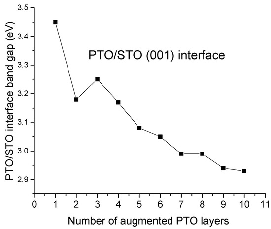 As we can see from Figure 9, our hybrid-DFT computed Γ-Γ band gap for the PTO/STO (001) interface, containing an 11-layer STO (001) substrate as well as a PbO (001) layer (x = 1), augmented on both sides of this substrate, is equivalent to 3.45 eV. For two PTO (001) layers, augmented from both sides on the 11-layer STO (001) substrate, the whole PTO/STO (001) interface system is terminated by the TiO2 (001) layers from both sides and has a Γ-Γ band gap equal to 3.18 eV (Figure 9). For three PTO (001) layers, augmented on the STO (001) substrate, the whole PTO/STO (001) interface is terminated by the PbO-terminated (001) layer from both sides and has a Γ-Γ band gap equal to 3.25 eV. As we can see from Figure 9, for four augmented PTO (001) layers (x = 4), the Γ-Γ band gap of PTO/STO (001) interface is equal to 3.17 eV, for 5 augmented layers (3.08 eV), for 6 layers (3.05 eV), for 7 layers (2.99 eV), for 8 layers (2.99 eV), for 9 layers (2.94 eV) and, finally, for 10 augmented PTO (001) layers, the Γ-Γ band gap of PTO/STO (001) interface is equal to (2.93 eV).