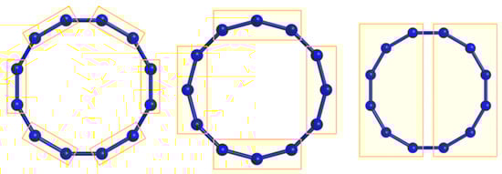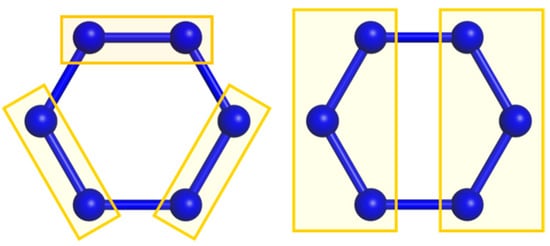 We construct clusters comprising neighbors (Figure 3), corresponding to the common divisors of N, thus reducing the point group accessible to cPHF, that is, , where . Rings with even N lack frustration and adopt UHF-type solutions in cHF. In contrast, for odd N (not studied here), frustration gives rise to genuine GHF solutions breaking symmetry.
