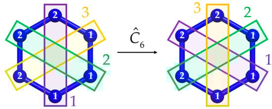 A spin rotation by 120 about an axis through the midpoint of a hexagon (, Figure 14), combined with a threefold site permutation about another hexagon is a second symmetry , and and are generators of a group isomorphic to group I. The full symmetry group of the classical (or GHF) solution is . This overall explains why GHF orbitals of C60 are up to six-fold degenerate: molecular orbitals span irreducible representations [52] of the double group .