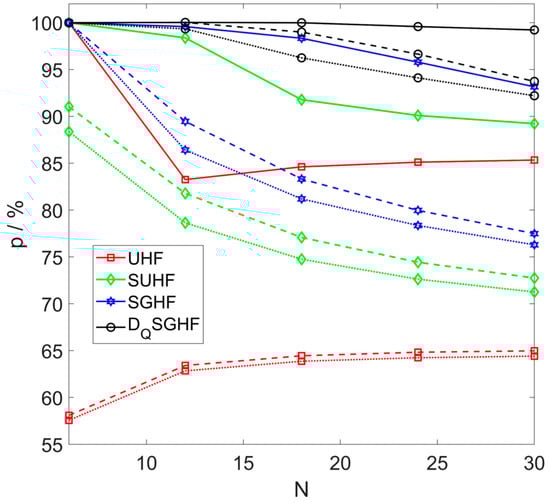 Relative correlation energies p (Equation (9)) from cluster variants of UHF, SUHF, SGHF and in antiferromagnetic spin rings with sites. Data points are connected by dotted (q = 2), dashed (q = 3) or solid lines (q = 6).