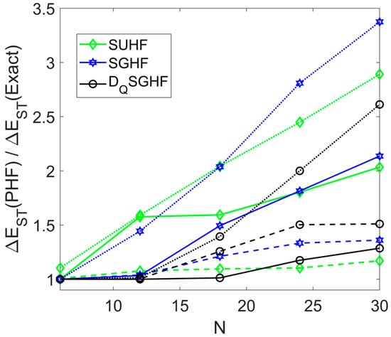 For or , all clusters are in the SUHF references for or projection. The fact that energies are lower than UHF shows that SUHF does not yield a singlet-product. For a given state, system, and q, the ordering reflects the breaking and restoration of additional symmetries. (In contrast, in the absence of a group/subgroup relation between cPHF variants, such as in the set SGHF, PGGHF, or PGSUHF, it is not possible to determine the ordering a priori.) The equality holds only when the lower-level method is exact. This applies to , , where UHF (and any PHF variant) is trivially exact, as well as in a few other cases, e.g., SGHF(2) yields the numerically exact and ground states for .