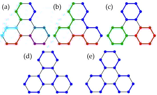 Cluster groupings in triphenylene conserving the full symmetry. In (a–c), clusters are shown in different colors; in (d,e), all dimer clusters are shown in the same color for simplicity.