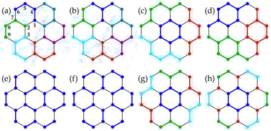 Cluster groupings in triphenylene (N = 24) with symmetries (a), (b,f–h), and (c–e). In (e,f), all dimers (q = 2) are shown in the same color for simplicity. In (g), three clusters comprise two separate trimers each. In (h), two clusters comprise three separate dimers, and six disconnected sites (red) constitute another cluster.
