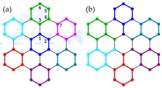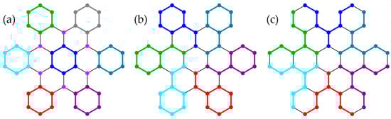 Systems with the connectivity of polycyclic aromatic hydrocarbons—triphenylene , coronene (N = 24), hexabenzocoronene (N = 42), hexa-cata-hexabenzocoronene (N = 48), and kekulene (N = 48)—allow us to briefly explore options for cluster formation (the chemical nomenclature for these systems is not meant to imply that the Heisenberg model describes properties of the respective organic molecules). The lattices are bipartite [33] and thus have S = 0 ground states. For and up to eight different groupings (Figure 6, Figure 7, Figure 8, Figure 9 and Figure 10; in some cases, the clusters are obviously not all equivalent), Table 2 compares energies from cUHF, cPHF, and cPT2 to exact results (available only for N = 18, 24).