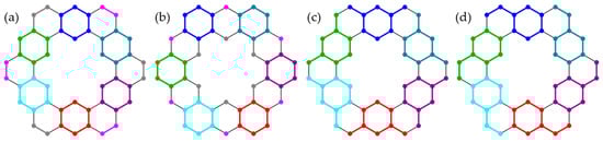 Due to computational limitations, we cannot carry out ED on the N = 42 and N = 48 lattices, but a comparison with cPT2 suggests that cPHF is still fairly accurate in these larger systems. In hexabenzocoronene, both options include a fraction of 42/54 bonds in the clusters. Although (Figure 8a) has seven intact rings, and thus loosely corresponds to the most favorable resonance structure with seven Clar sextets [34], (Figure 8b) with six sextets is energetically very slightly favored in , though not in UHF (Table 2). In hexa-cata-hexabenzocoronene, with 42/60 bonds in seven rings (Figure 9a) yields a significantly lower energy than with the same number of intracluster bonds but no intact rings (Figure 9c) and is even slightly better than with 48 intracluster bonds but only six rings (Figure 9b). Finally, in kekulene, grouping (d) predicts the lowest energy, despite symmetry breaking. In contrast to (a), (c), and (d), the six Clar sextets are broken up in (b), which features only 36/60 bonds and yields higher energies in cHF, cPHF, and cPT2.