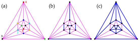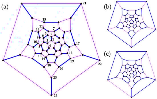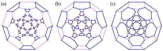Three cluster groupings in the icosahedron conserve ((a), ), ((b), ), or symmetry ((c), ). In the planar projections (Schlegel diagrams), interacting sites belonging to the same or to different clusters are connected by blue or pink lines, respectively. In (a), the color of sites assigns them to one of six clusters. Sites forming symmetry-inequivalent pairs with site 1 are numbered in (a).