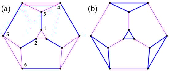 Two complementary cluster formations preserve spatial symmetry by including either the 30 u-bonds between pentagons (q = 2, Figure 15a) or the 60 f-bonds in the pentagons (q = 5, Figure 15b). Classical spins are antiparallel on u-bonds (see Figure 15a) and span angles of 144° on the f-bonds. We additionally consider fused hexagons (, Figure 15c), thereby including 36 f-bonds and all 30 u-bonds in the clusters and reducing symmetry, .