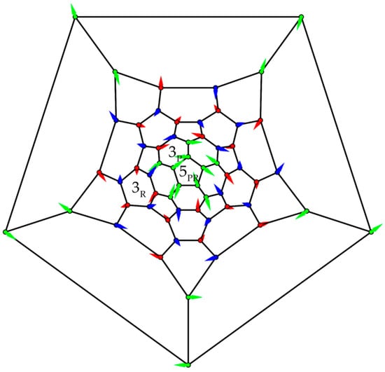 In contrast to icosidodecahedral arrangements of spin centers in Keplerate molecules [37,38], [39], [40], and [41,42], with for V3+, Cr3+, Fe3+, truncated icosahedra were not yet synthetically realized as magnetic molecules. The respective Heisenberg model was nevertheless addressed in a few works [29,43,44,45,46,47,48,49], some of which were motivated by gaining an understanding of the properties of buckminsterfullerene C60. However, electronic-structure calculations have shown that the Heisenberg model is at best of qualitative value for C60 because this molecule possesses unpaired electrons [50] (but note that there is no unique measure for this number). It was eventually concluded that C60 displays no significant strong correlation [51]. Ab initio GHF calculations [50] on C60 still reproduce the exotic three-dimensional spin-density pattern of the classical Heisenberg ground state [29]. Geometry optimization on the GHF level-of-theory yields a perfect structure for C60 [50], but the spatial inversion is the only obvious self-consistent symmetry of the GHF solution. We specify the hidden icosahedral symmetry I in Figure 14, where classical spin vectors are plotted in a Schlegel diagram. A uniform rotation was applied such that spins in the central pentagon in Figure 14 lie in the geometrical plane of that pentagon, with the spin on the first site pointing in the negative x-direction. This spin configuration is left unchanged by a combined spin rotation (R) by 144° and a five-fold site permutation (P). In the electronic-structure problem, the site permutation corresponds to a spatial rotation. These operations are performed about an axis through the coordinate origin (the center of the truncated icosahedron) and the center of the central pentagon (marked in Figure 14).