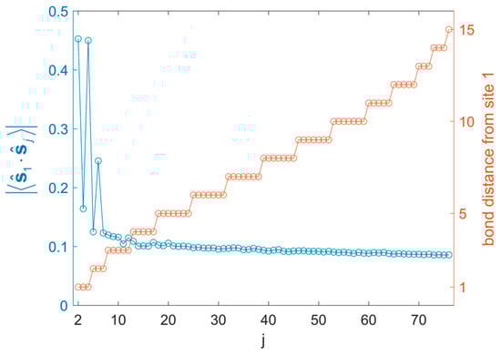 Dimers of the sites related by spatial inversion conserve symmetry (Figure 12a), while nearest-neighbor pairs break symmetry (, Figure 12b), as do hexamers (, Figure 12c). For , the antiferromagnetic spin-pair correlation between the most distant sites (numbers defined in Figure 12a) exceeds the NN correlation in the exact wave functions, see Table 4.
