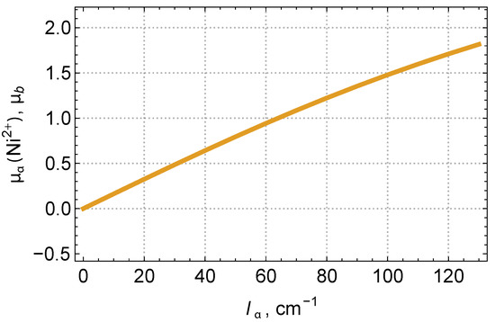 This expression reproduces well the result of the numerical calculation via diagonalizing the energy matrix on the basis of all the states of the Ni () term. Figure 2 shows that the nickel magnetic moment is approximately proportional to the exchange field parameter and can reach values typical of a single spin. Note that our scenario for the origin of the Ni magnetic moment explains the reason for the differences in the magnetic moment values in the ferrimagnetic (at K) and antiferromagnetic (at K) phases obtained in [15] (see Table 2). In addition, an interesting feature of Figure 2 is that, in the external magnetic field along the a-axis, a notable quadratic effect over the applied magnetic field is expected. This effect could be tested experimentally.