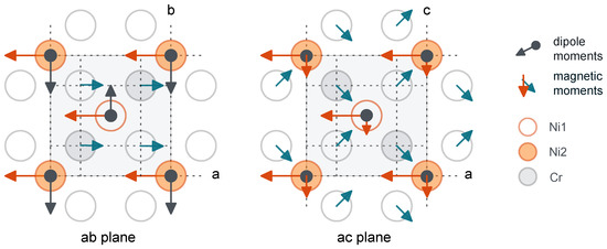 The schematic projections of the magnetoelectric structure onto the ab- and ac-plane (the orthorhombic distortions of the lattice are not visible). It was assumed that the magnetic moments of Ni1 and Ni2 are directed along the a-axis (as shown in Figure 10 in [15]). The coordinates of the ions in the unit cell are given according to [16].