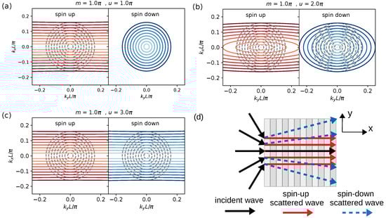 Figure 5 shows the energy surfaces obtained from Equation (9). The dispersion of this supercell configuration is near the zero-energy point. Depending on the values of m and u, the shape of the energy surfaces can take the form of a circle, an ellipse, or a series of straight lines. The approximation of the velocity mentioned above can indicate critical shapes, such as circles and straight lines (Equation (15)). Under , the energy surfaces of both spin structures differed greatly from each other (see Figure 5a). Because the miniband was critically broadened on the axis, which corresponded to , the energy surface exhibited straight lines parallel to the axis during spin-up. On the contrary, for spin-down, circles were observed, as in the pristine graphene, which corresponded to , and there were no restrictions on electron motion. The velocity results of both spin indexes were zero, and the energy surfaces of both spin indexes are shown as straight lines in Figure 4c (see Figure 5c). As a result of this superlattice model, the spin-up electron can beam as electron-optic collimation, but the spin-down electron cannot, and vice versa. This feature can be realized as an electric controllable-spin supercollimator that can regulate each spin-index electron wave. For instance, one spin is highly collimated but not the opposite one.