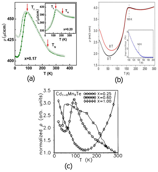 - Haas, C. Spin-Disorder Scattering and Magnetoresistance of Magnetic Semiconductors. Phys. Rev. 1968, 168, 531. [Google Scholar] [CrossRef]