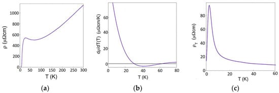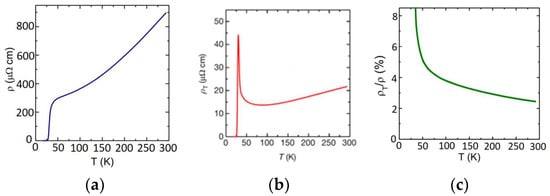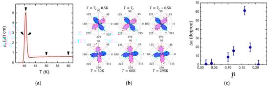 In Figure 2a, we show the temperature dependence of the longitudinal resistivity for one representative doping, p = 0.10. (This parameter p is not measured directly but is inferred from the measured Tc by assuming a putative parabolic relation, as we discussed in [29] and as it is customary; we use it to facilitate the comparison with the literature, but none of our conclusions depend on this convention.) The data agree with the previous results in the literature and show a superconducting transition at Tc ≈ 30 K. The same device, already at room temperature, shows a nonzero transverse voltage even without any magnetic field applied. This means that the corresponding transverse resistivity is nonzero, as shown in Figure 2b, and hence, the fourfold rotational symmetry (C4) is broken.