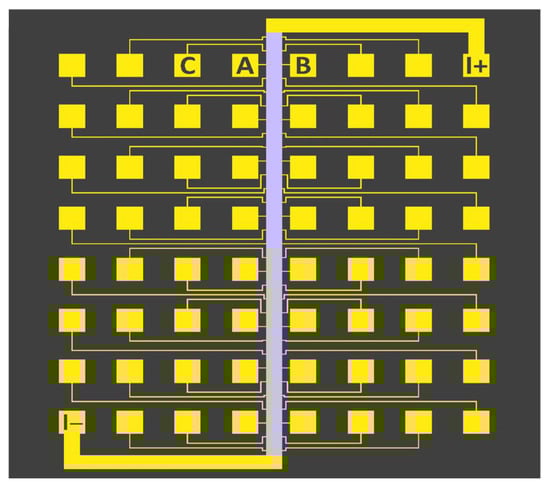 The 32-pixel pattern, with 64 Au contacts spaced in 300 µm steps. This pattern allows for simultaneous measurement of the longitudinal resistivity or magneto-resistivity (using, for example, pads A and C) in 30 devices (‘pixels’) and the transverse resistivity and Hall effect (using pads A and B) in 31 devices. Adapted from [30].